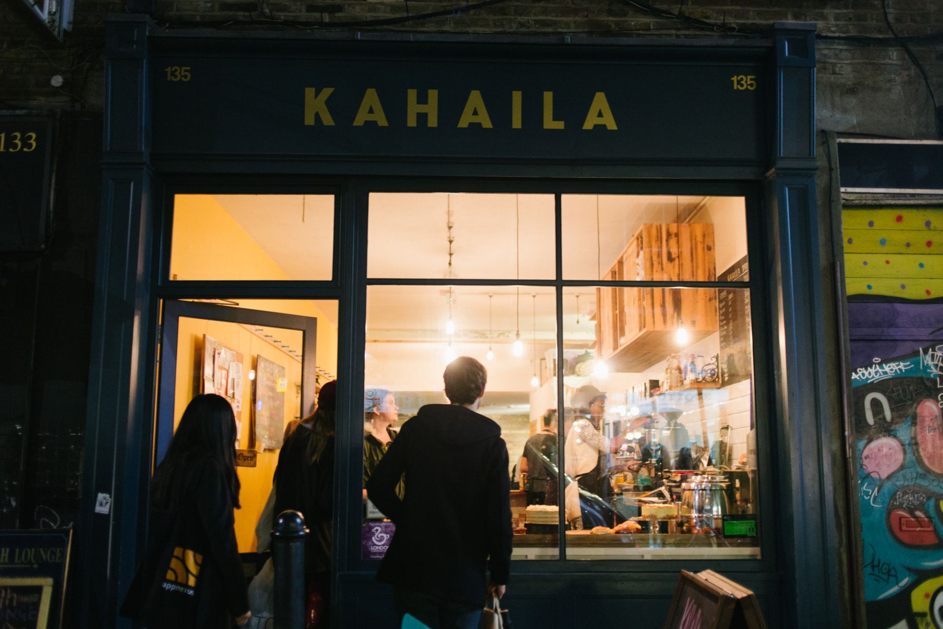 Kahaila er í Austur London á hinni einu sönnu Brick Lane, mekka hipstersins. Á þeirri götu og í hverfinu þar í kring er mikið úrval af skemmtilegum kaffihúsum. Á Kahaila er andrúmsloftið þægilegt, nóg pláss og og sanngjarnt verð. Kökurnar í glugganum laða hvern viðskiptavininn inn af öðrum og er rauða flauelskakan í uppáhaldi flestra, okkar þar á meðal.