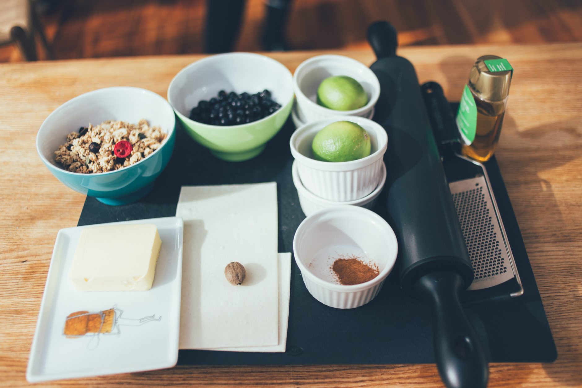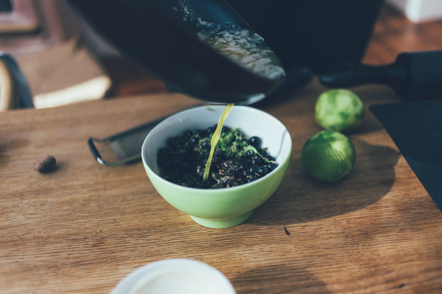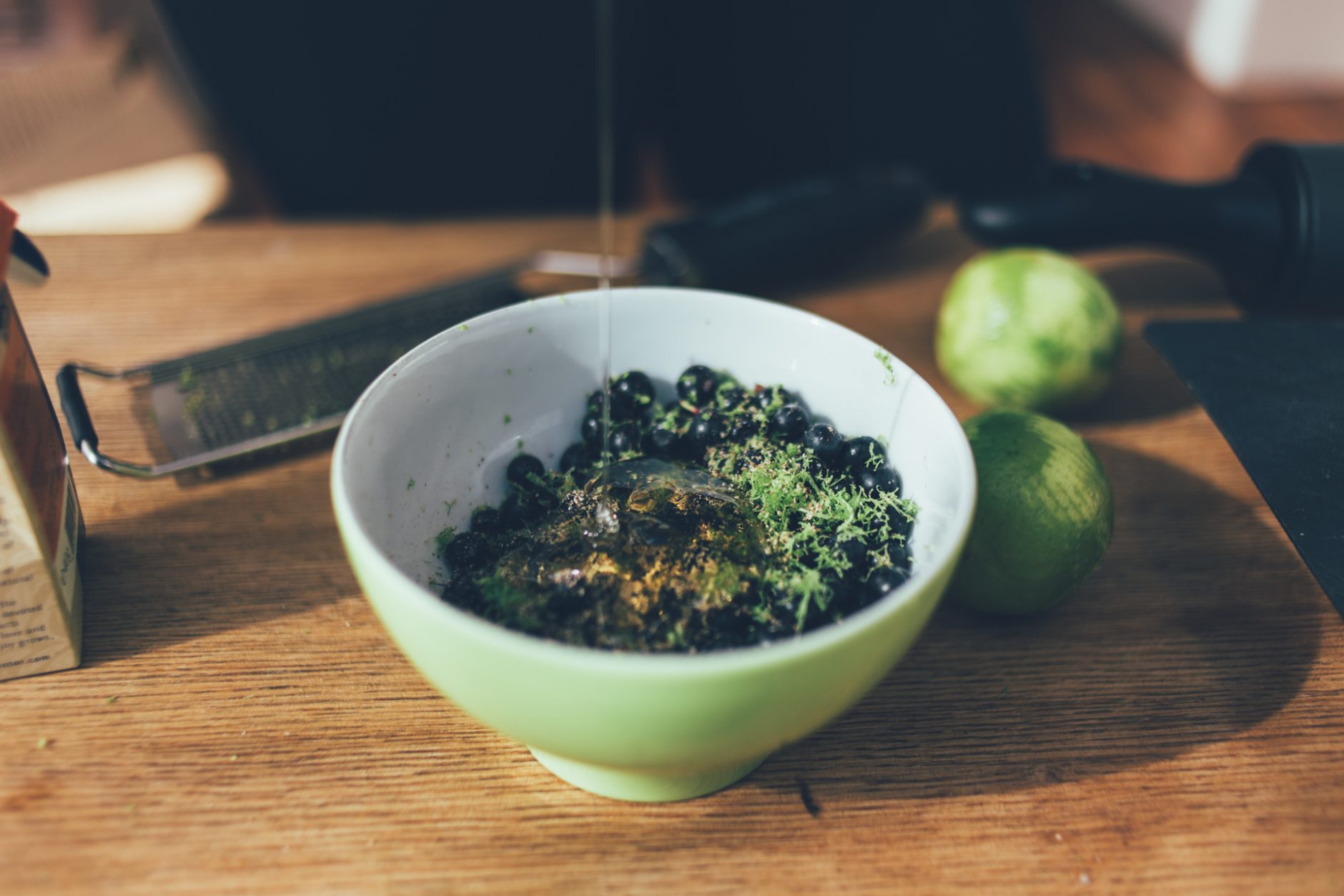 Blandið kanil, múskati, lime berki, safa úr ½ lime og hunangi saman í skál ásamt bláberjunum.