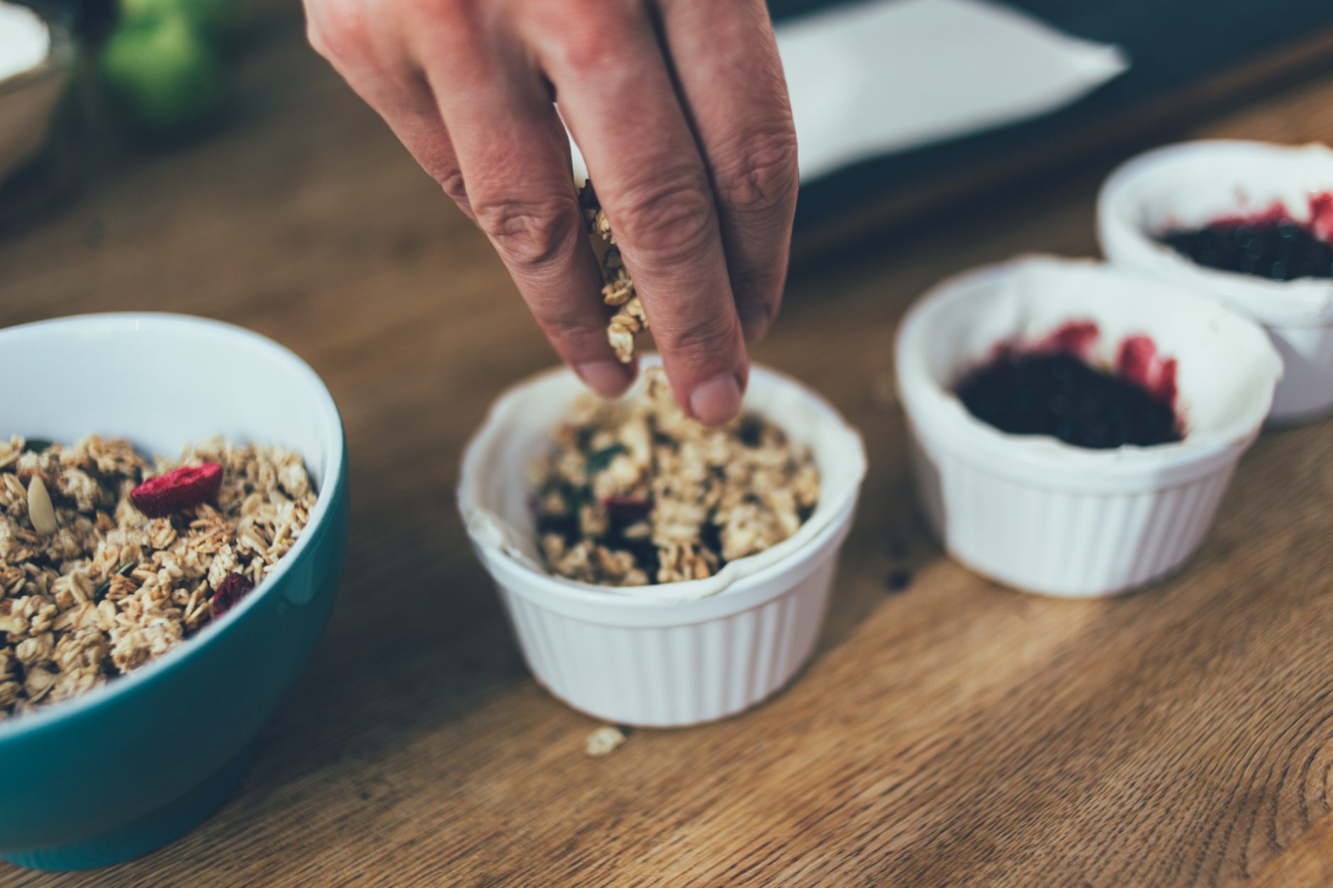Þá má hella bláberjafyllingunni í mótið, ofan á smjördeigið. Toppið með múslí þannig að það þekji vel.