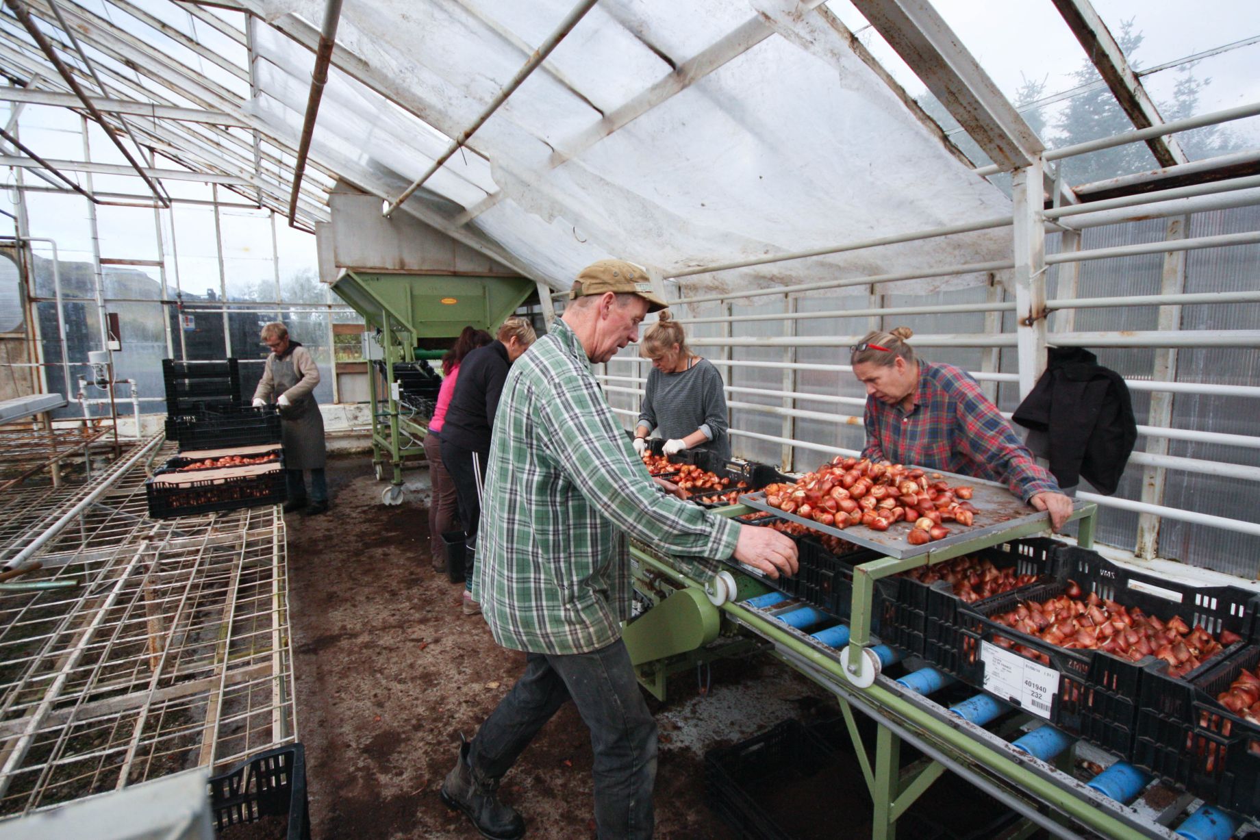 Í einu af gróðurhúsunum er allt á fullu. Starfsfólk stendur við færiband að setja niður túlípanalauka. „Laukarnir sem við erum að setja niður núna eru jólalaukarnir og verða farnir að blómstra í desember. Túlípanarnir eru vetrar- og vorblóm. Laukarnir þurfa að vera í kæli í 16 vikur til þess að þroska blómið,“ útskýrir hann.