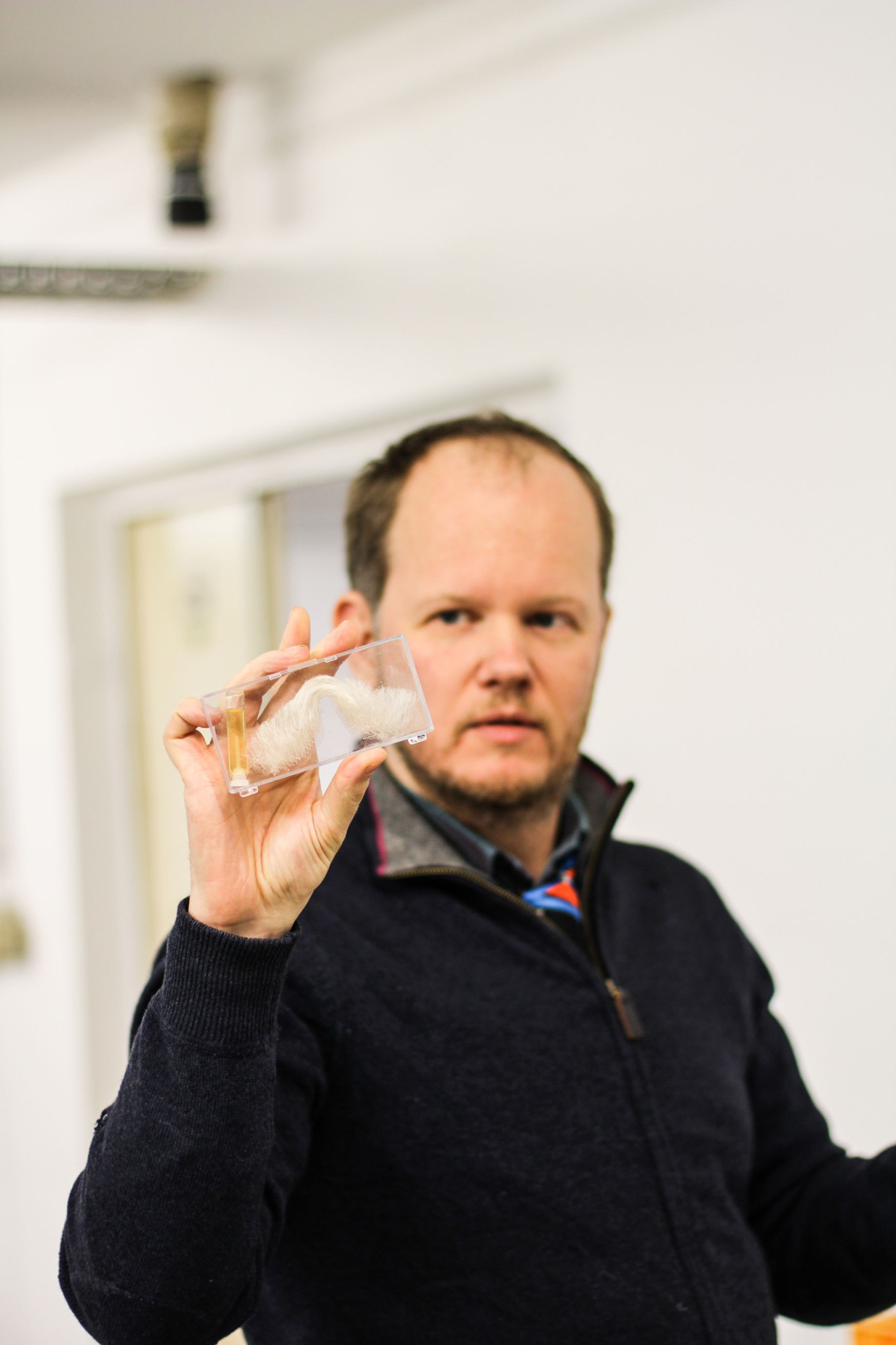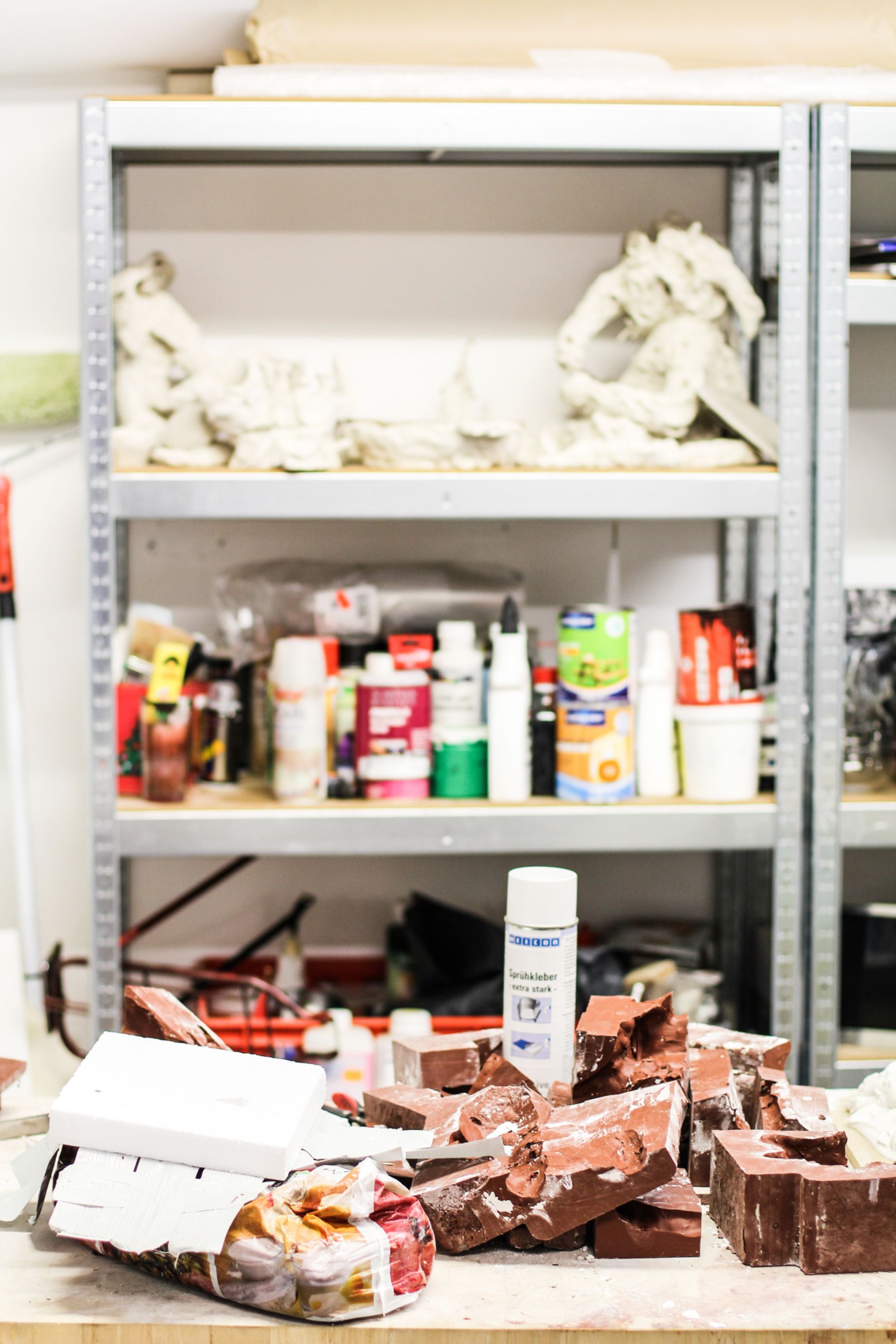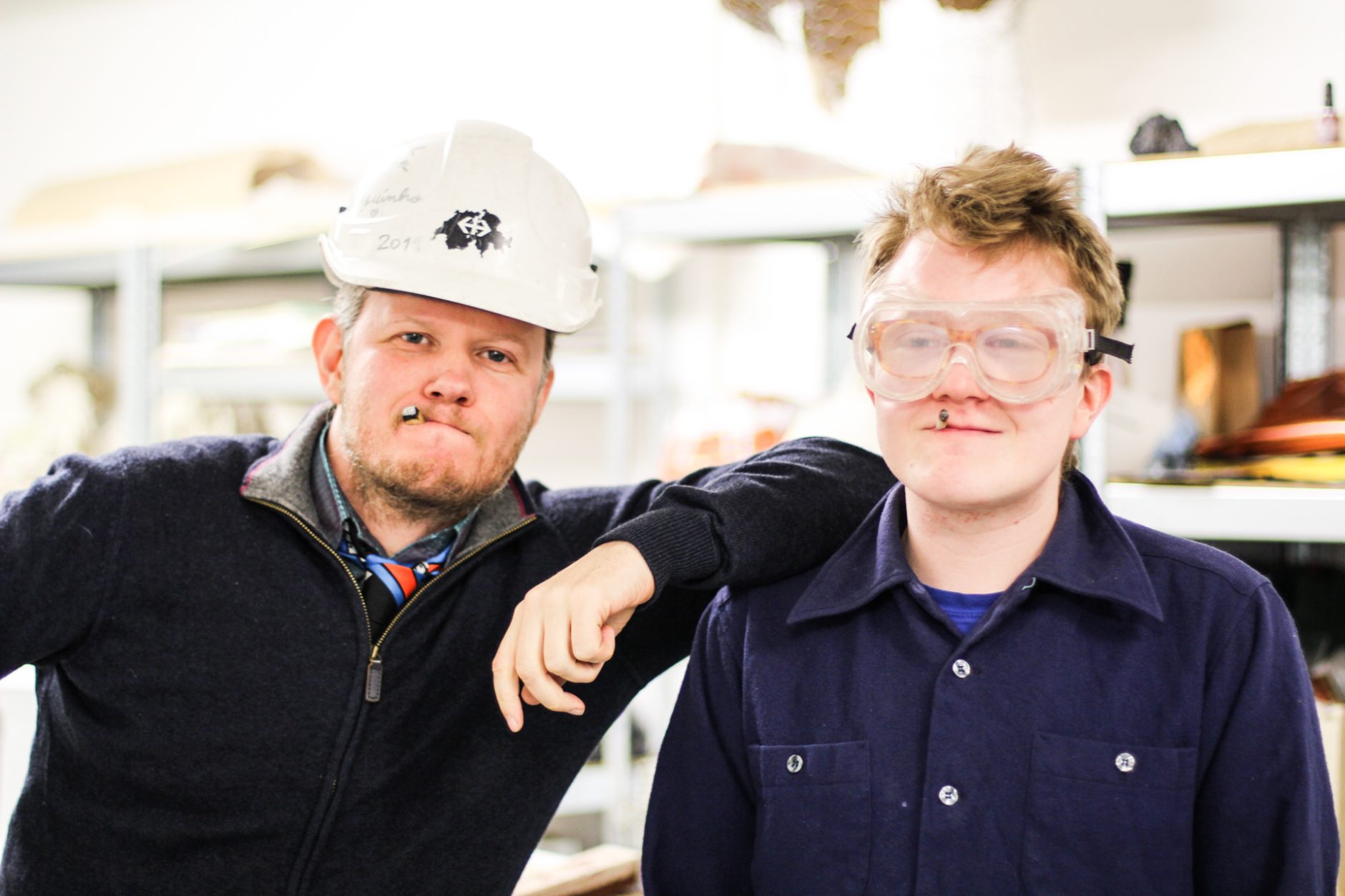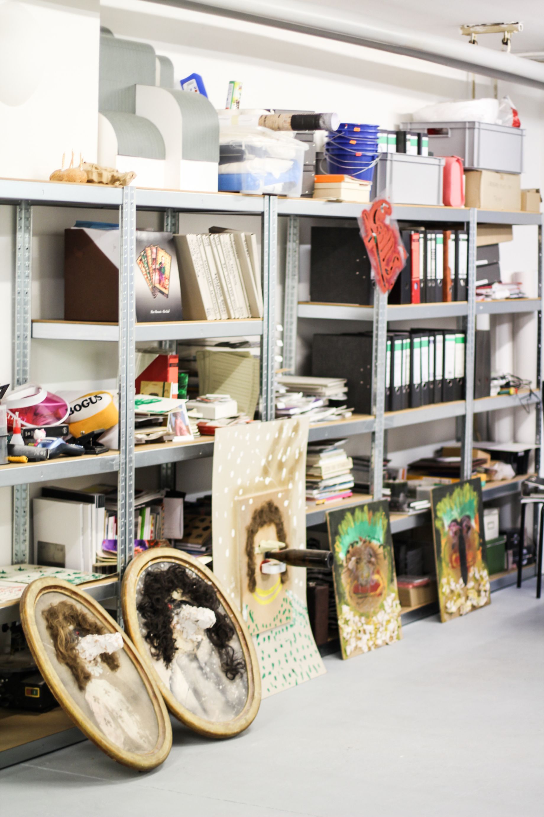 Egill: Já, þetta er partur af bakarísverkefninu mínu. Þá tökum við alltaf það sem var síðast eftir í bakaríinu og setjum til dæmis upp á vegg, og svo hrúgast alltaf upp meira og meira dót. Hér er til dæmis gervi skegg og gervi augabrúnir á bakarann.
