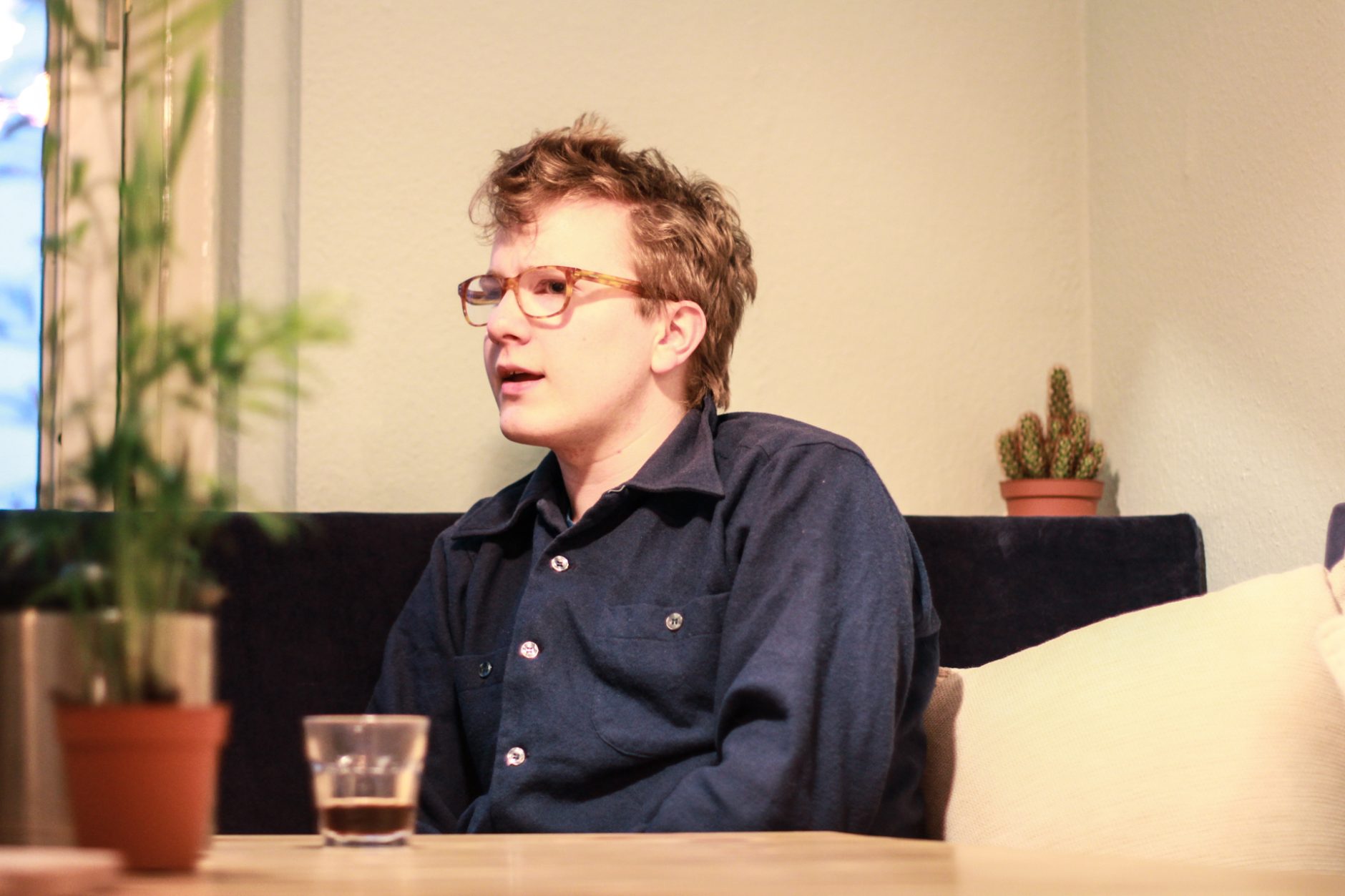 Egill: Svo er hann í gestavinnustofudvöl hérna hann Magnús Jensson, arkitekt og tónskáld. Ég held hann hafi farið út að fá sér að borða, þess vegna er hann ekki hérna núna. Hann er mikill arkitektúrspekúlant og kemur með í ferðina. Við erum svo aðeins að taka rýmið í gegn, þess vegna erum við að pússa þessi borð til að geta leigt þau út og þá getur fólk komið og fengið vinnupláss. Svo eru það sófarnir.