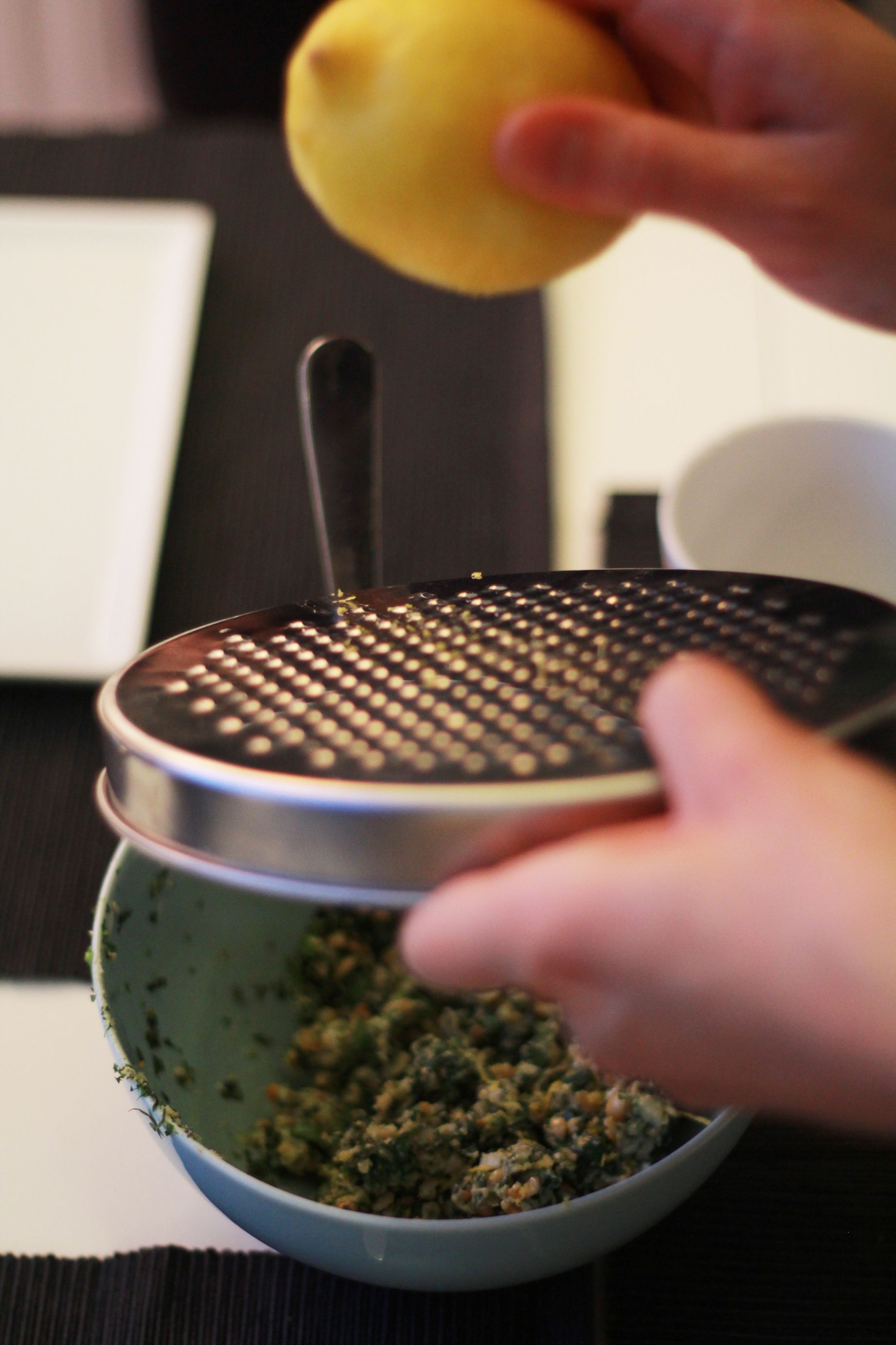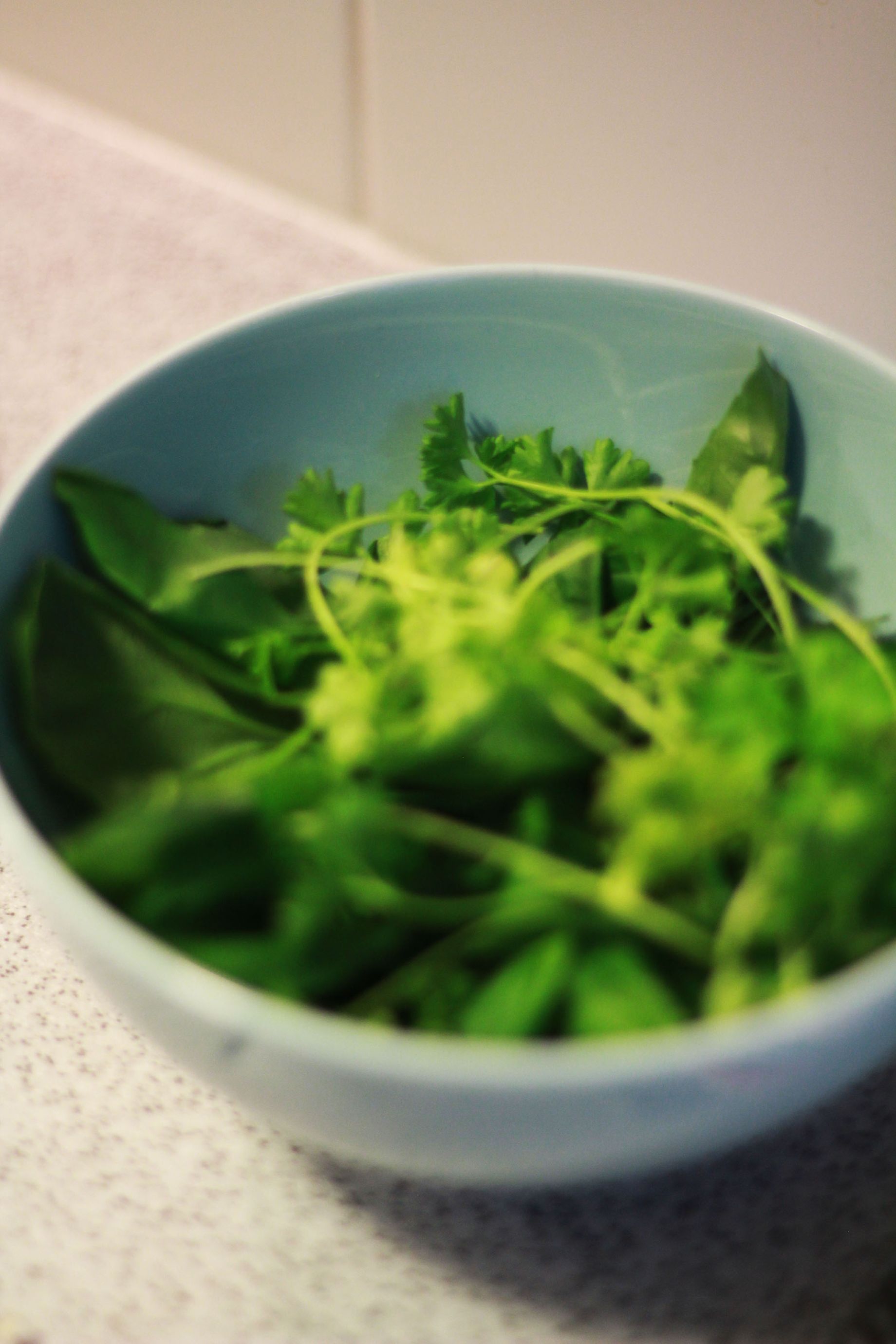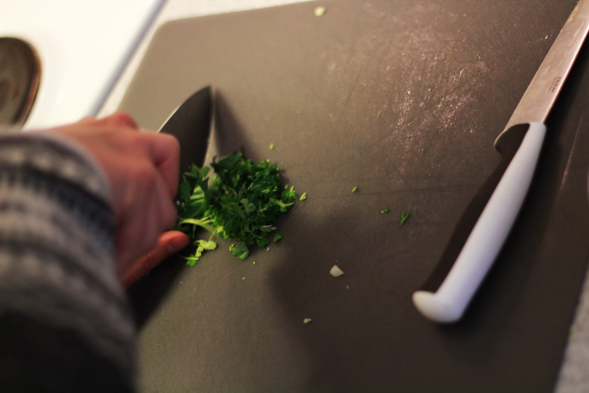 1. Saxa hvítlauk eins smátt og ég get/nenni. Þegar hann er orðinn mjög fínn set ég basil ofaná og saxa; aftur mjög smátt. Bæti svo steinselju ofan á og saxa saman við.