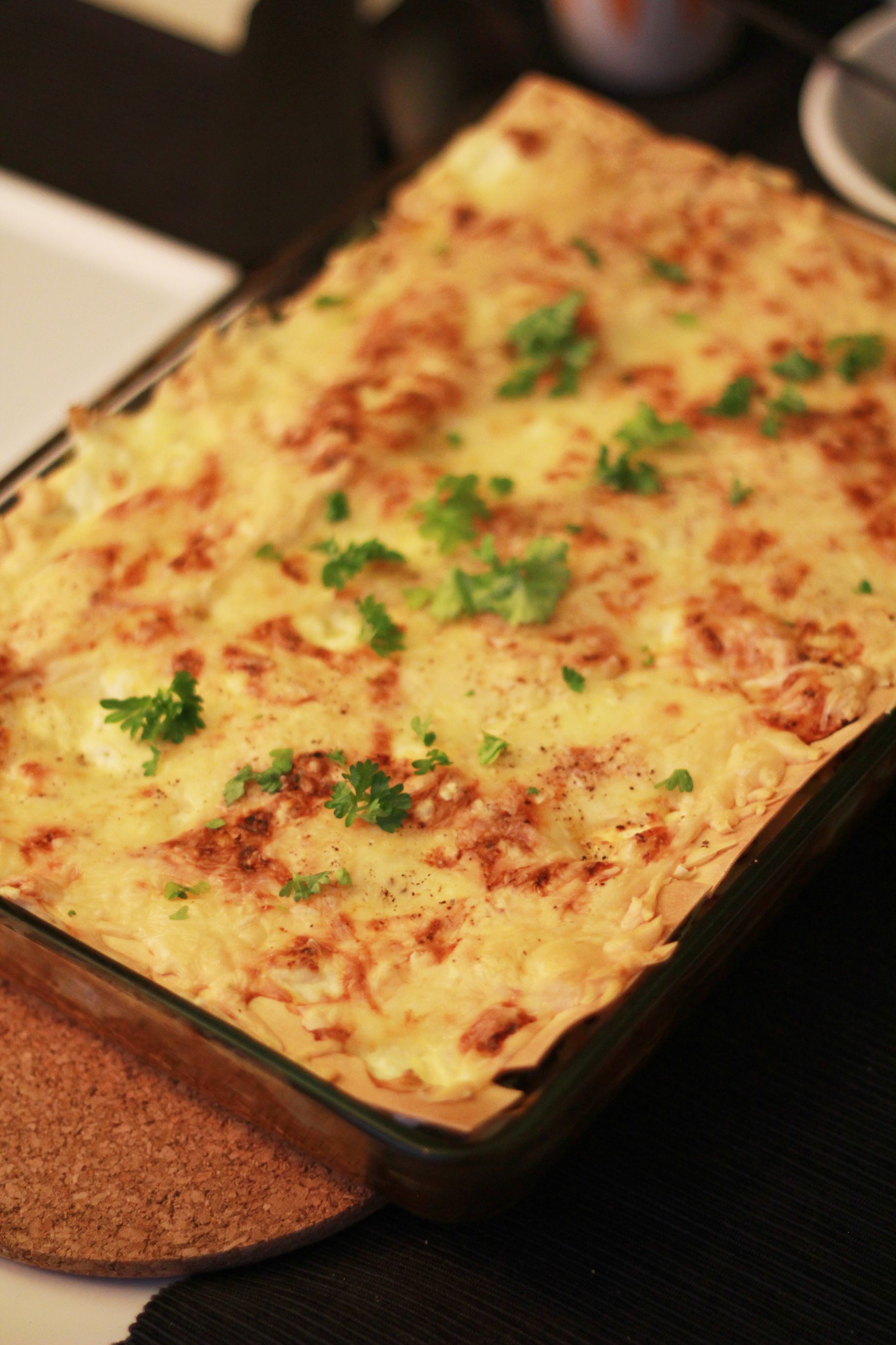 4. Raða lasagne plötum neðst í ofnfast form. Set allt hakkið ofan á og dreifi.
