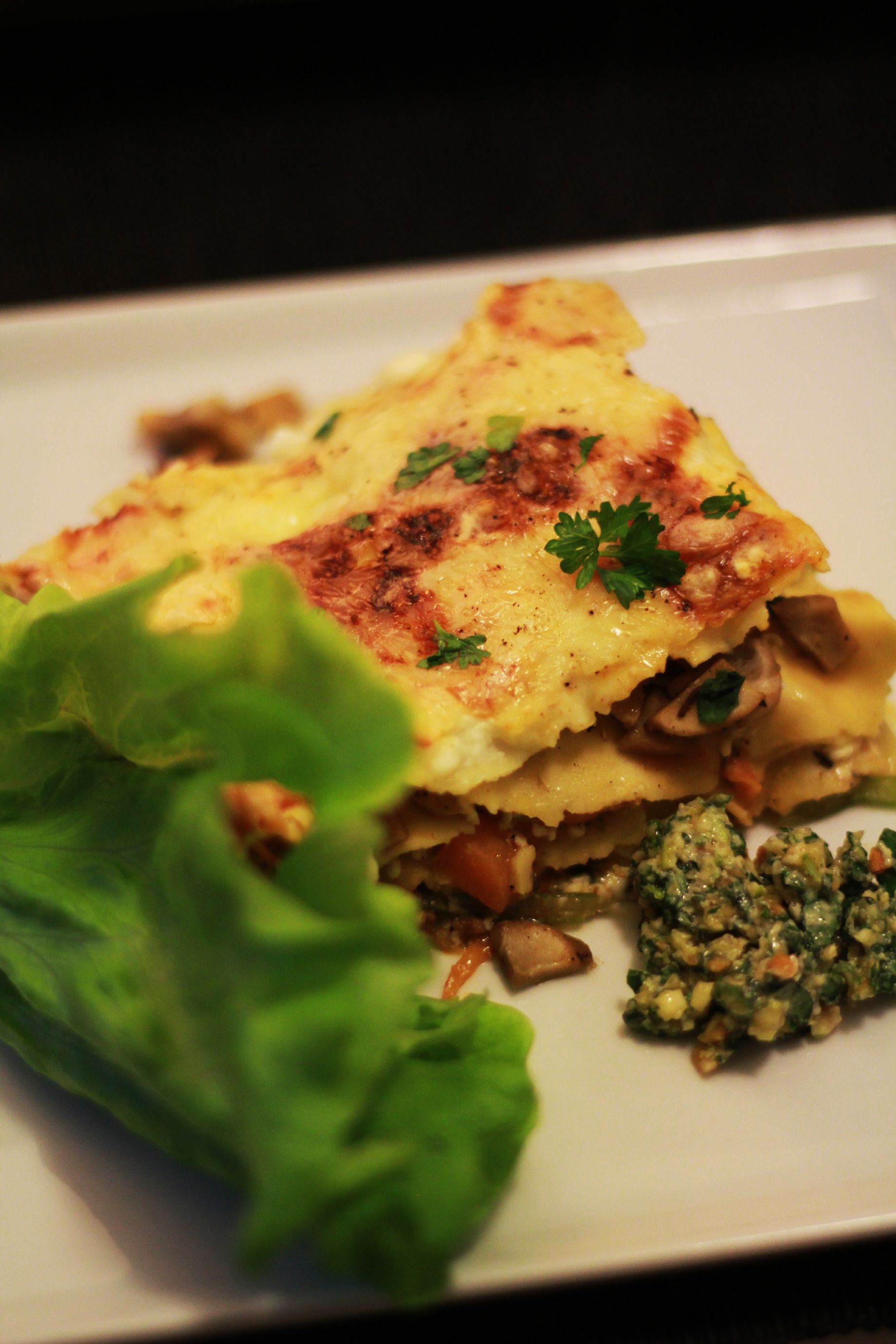 6. Önnur röð af lasagne plötum. Dreifi svo sveppunum jafnt yfir og set spínat ofan á þá. Magn af spínati; þar til sveppirnir eða plöturnar fyrir neðan sjást ekki.