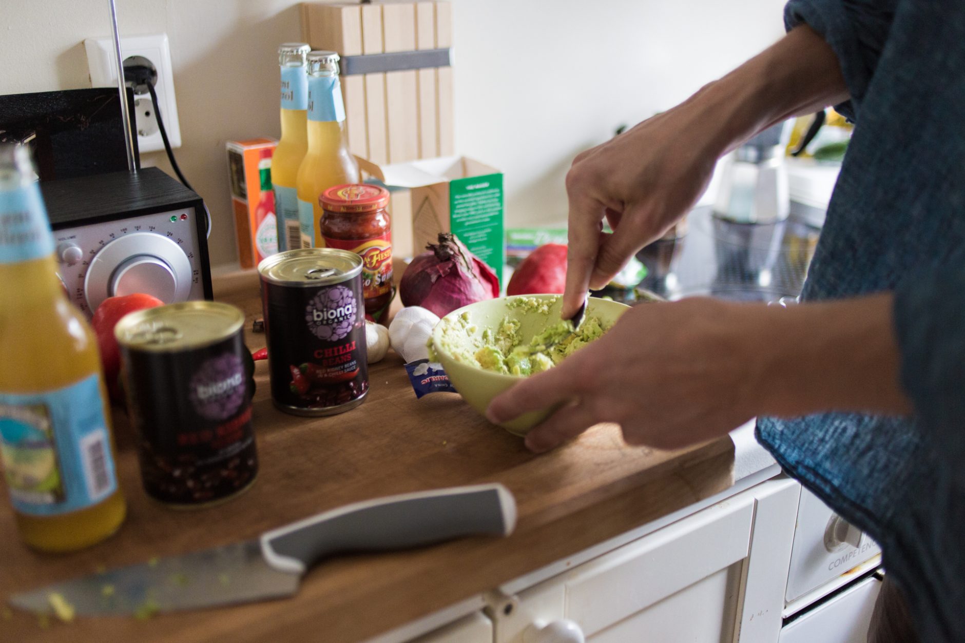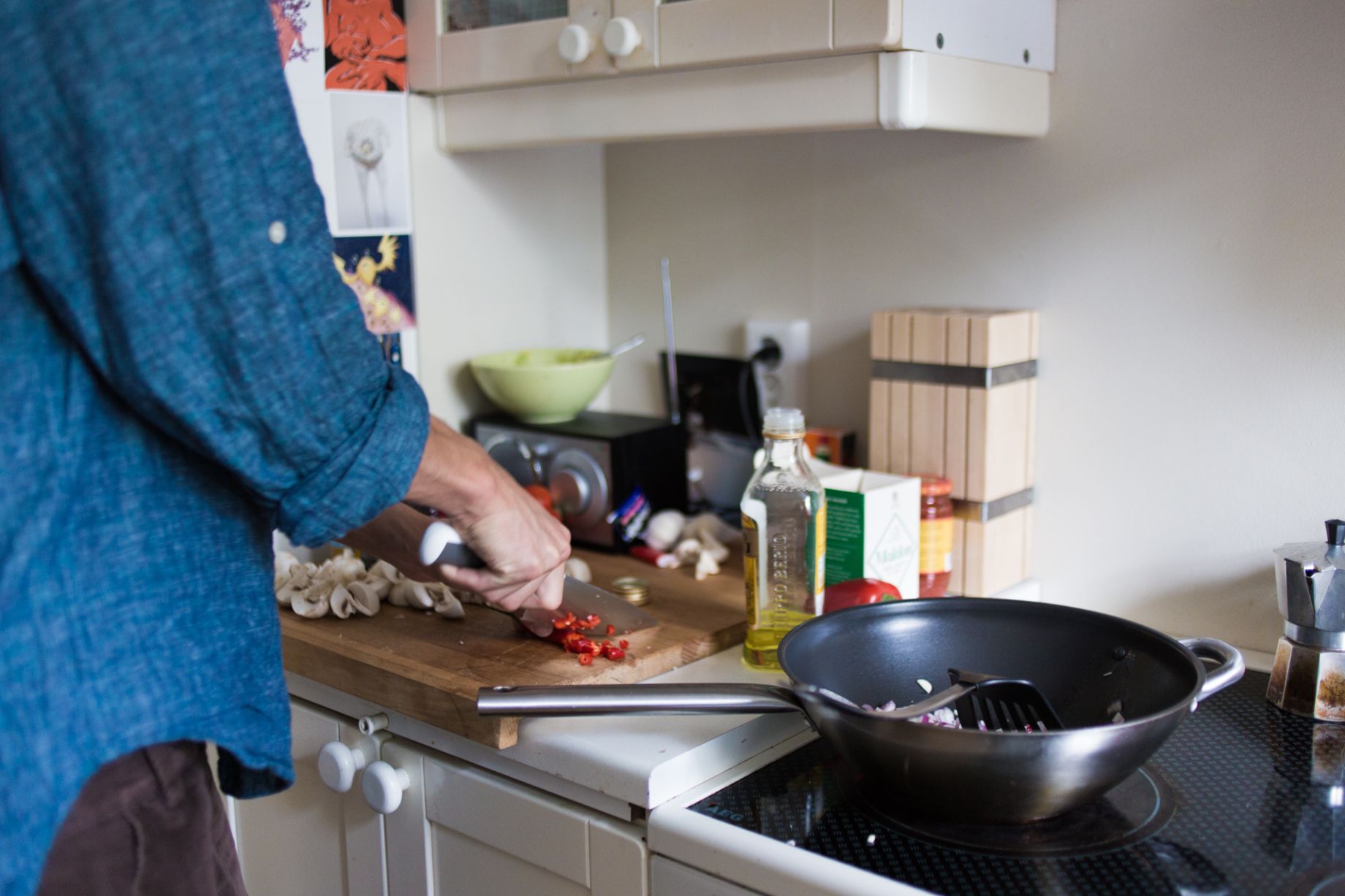 Ég byrja yfirleitt alla mína eldamennsku eins. Hvort sem ég matreiði karrý, súpu eða kjúklingarétt þá legg ég áherslu á sama grunninn: laukur, hvítlaukur og grænmeti steikt upp úr salti, olíu og kryddi. Í þessari tilraun ætla ég að bæta við sveppum og baunum en það má setja hvað sem er, hér er ekki hægt að gera neitt vitlaust. Ég reyni auðvitað að hrista upp í þessu á milli rétta svo mataræðið sé ekki einsleitt en þetta er góður staður til þess að byrja á og gerir eldamennskuna einfalda. Síðan bæti ég grænmetistening út í og smá af cayenne pipar sem ég er hrifinn af. Þessi krukka hefur enst mér í tvö ár enda má alls ekki setja of mikið. Þá má leyfa þessu að malla og skera niður grænmeti í leiðinni.