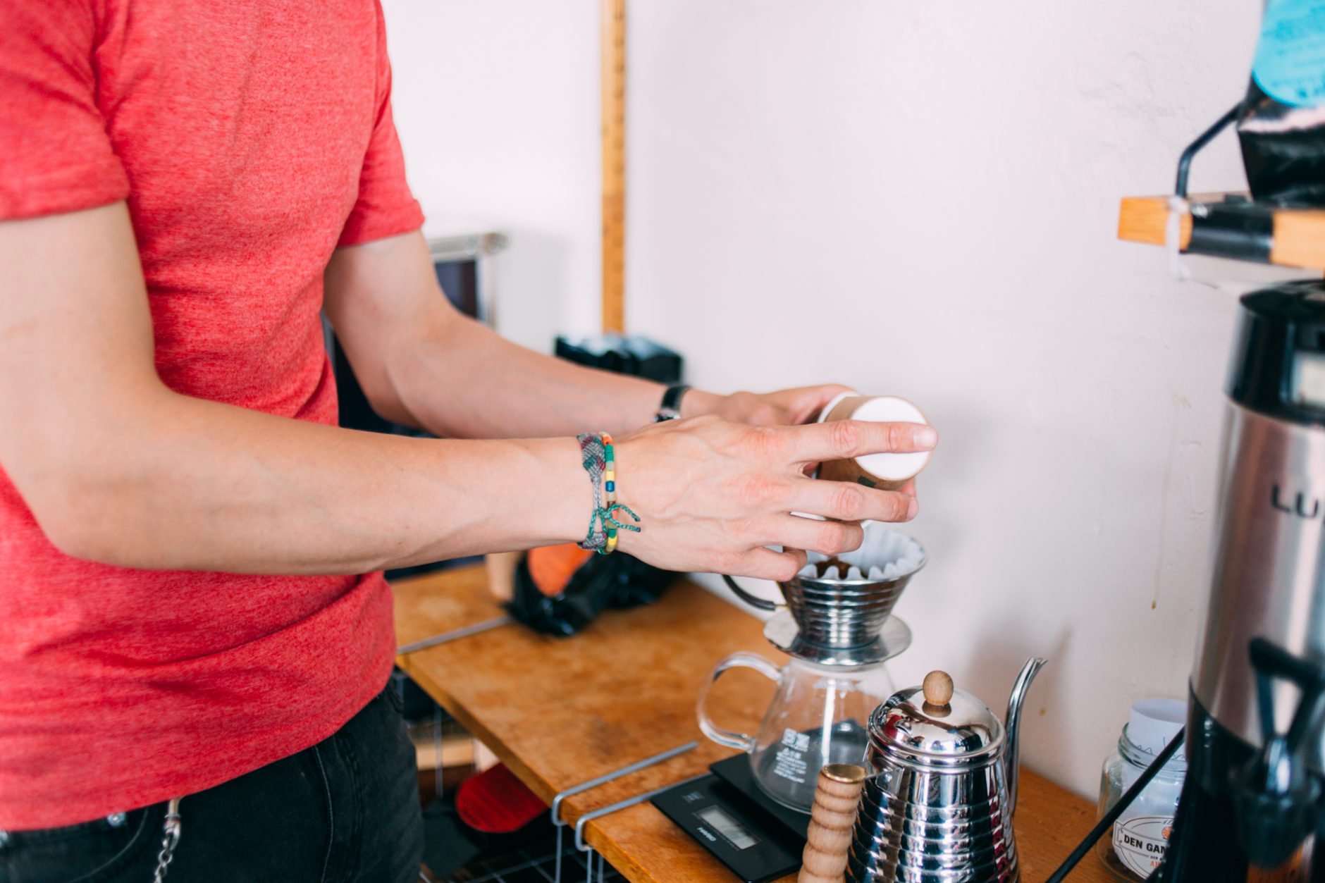 Torfi byrjar á því að kynna fyrir okkur Kalita Wave uppáhellingu. „Þetta hefur verið í uppáhaldi hjá mér í einhvern tíma. Þetta er bolli sem tekur smá tíma að útbúa en er vel þess virði. Við byrjum á því að vigta baunirnar en uppskriftin sem við notum núna eru 38 grömm af nýju Kólumbíu baununum okkar á móti hálfum lítra af vatni. Að þessu loknu skolum við filterinn til þess að losna við pappabragðið sem getur komið frá honum. Einnig er gott að gera þetta til þess að hita upp græjurnar og ná betri stöðugleika á hitanum. Þá má bleyta kaffið í filternum og fá það til þess að „blómstra“ í 40 sekúndur. Hella á síðan heita vatninu úr könnunni með litlum hringlaga hreyfingum í miðjuna. Það hjálpar að vera með könnu frá Kalita þar sem mjói stúturinn nær stöðugri en mjórri bunu. Þá er bara að hræra aðeins í uppáhellingnum og bera fram.“