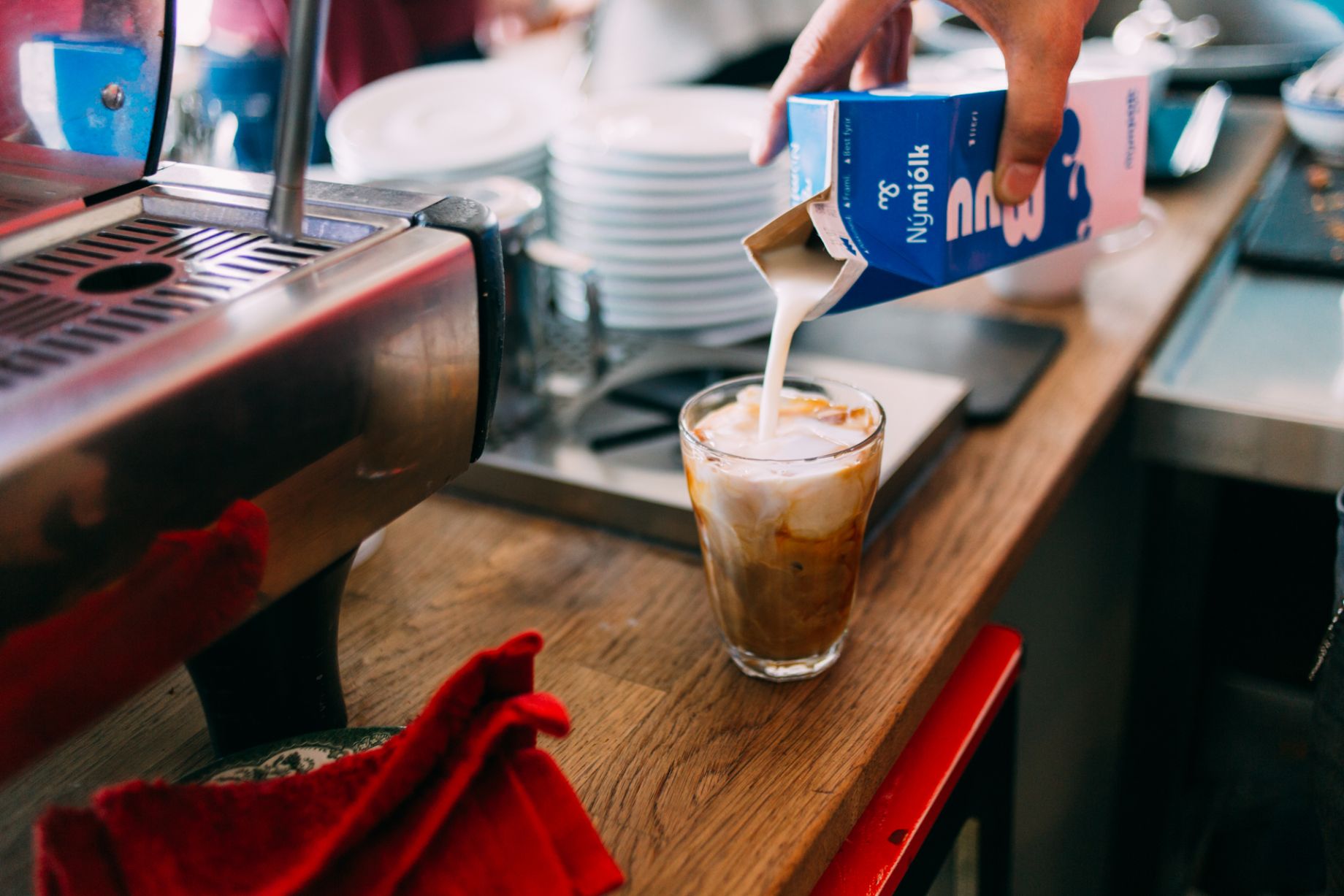 „Hellt er upp á tvöfaldan espressó og nóg af klökum bætt út í. Við erum vanalega með lífræna mjólk frá Bióbú sem gefur áberandi besta bragðið en núna er tímabundin bilun í áfellingarvélinni þeirra svo við látum nýmjólkina duga. Það skemmtilega við lífrænu mjólkina er hversu lifandi hún er. Hún breytist dag frá degi allt eftir því hvað kýrin borðar og hvaða árstíð er. Út í þetta bætum við síðan einu skoti af hrásykurssírópi sem við útbúum hérna, en það er hægt er að nota hvaða sætu sem er. Drykkurinn er ekki hugsaður sem sætur drykkur heldur er þetta rétt til að losna við beiskjuna sem kemur við að kæla kaffi.“