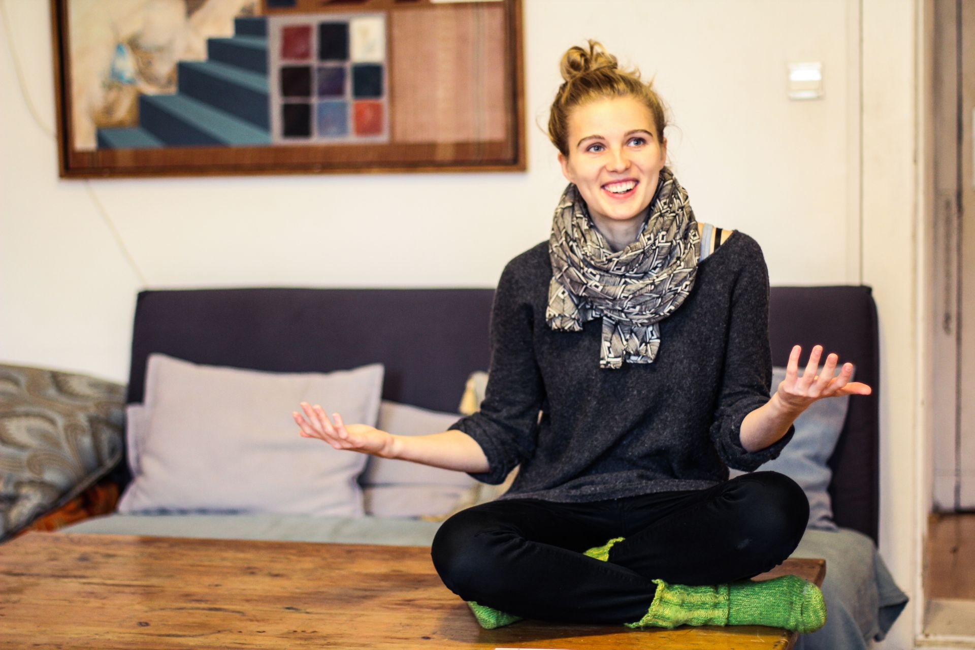 „Það er mjög lítið af peningum í Berlín og þá sérstaklega í listum. Allt listarstarf er gert af rosalegri hugsjónastarfsemi og ég held að flestir atvinnulistamenn fái peningana sína annars staðar frá en búi hér því það er ódýrt að lifa hérna svo maður kemst lengur af með peninga frá til dæmis Noregi eða Sviss.