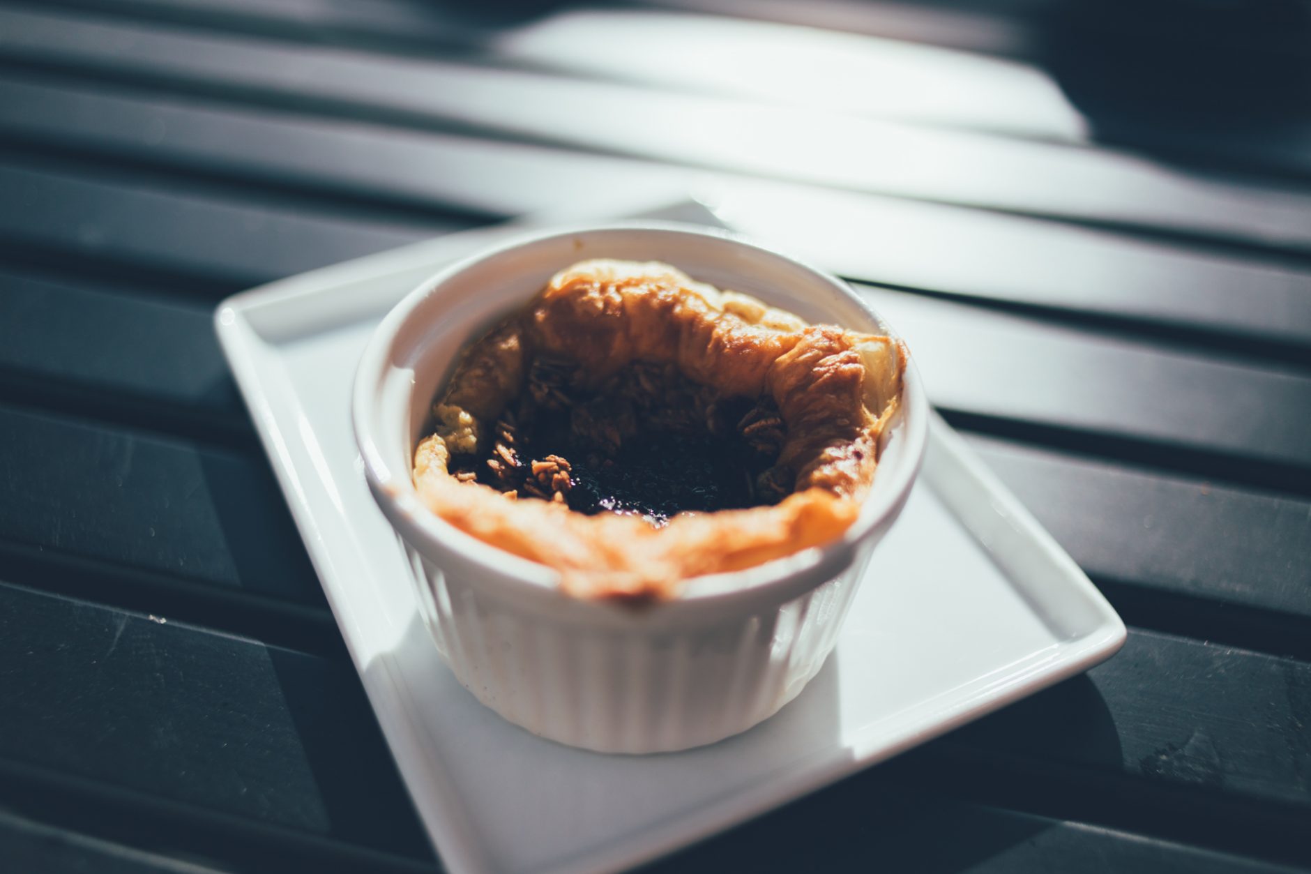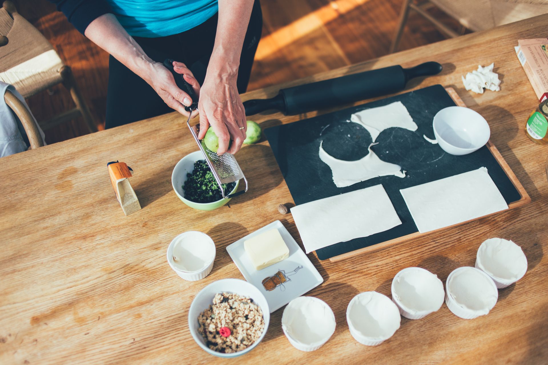 Fletjið og raðið smjördeiginu í botninn og upp kantana á eldföstu móti. Það má nota eitt stórt ílát eða mörg lítil, hvoru tveggja gengur upp.