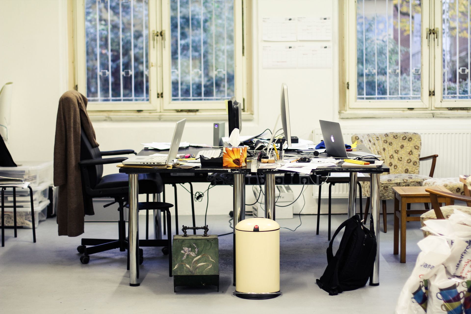 Egill: Svo er hann í gestavinnustofudvöl hérna hann Magnús Jensson, arkitekt og tónskáld. Ég held hann hafi farið út að fá sér að borða, þess vegna er hann ekki hérna núna. Hann er mikill arkitektúrspekúlant og kemur með í ferðina. Við erum svo aðeins að taka rýmið í gegn, þess vegna erum við að pússa þessi borð til að geta leigt þau út og þá getur fólk komið og fengið vinnupláss. Svo eru það sófarnir.