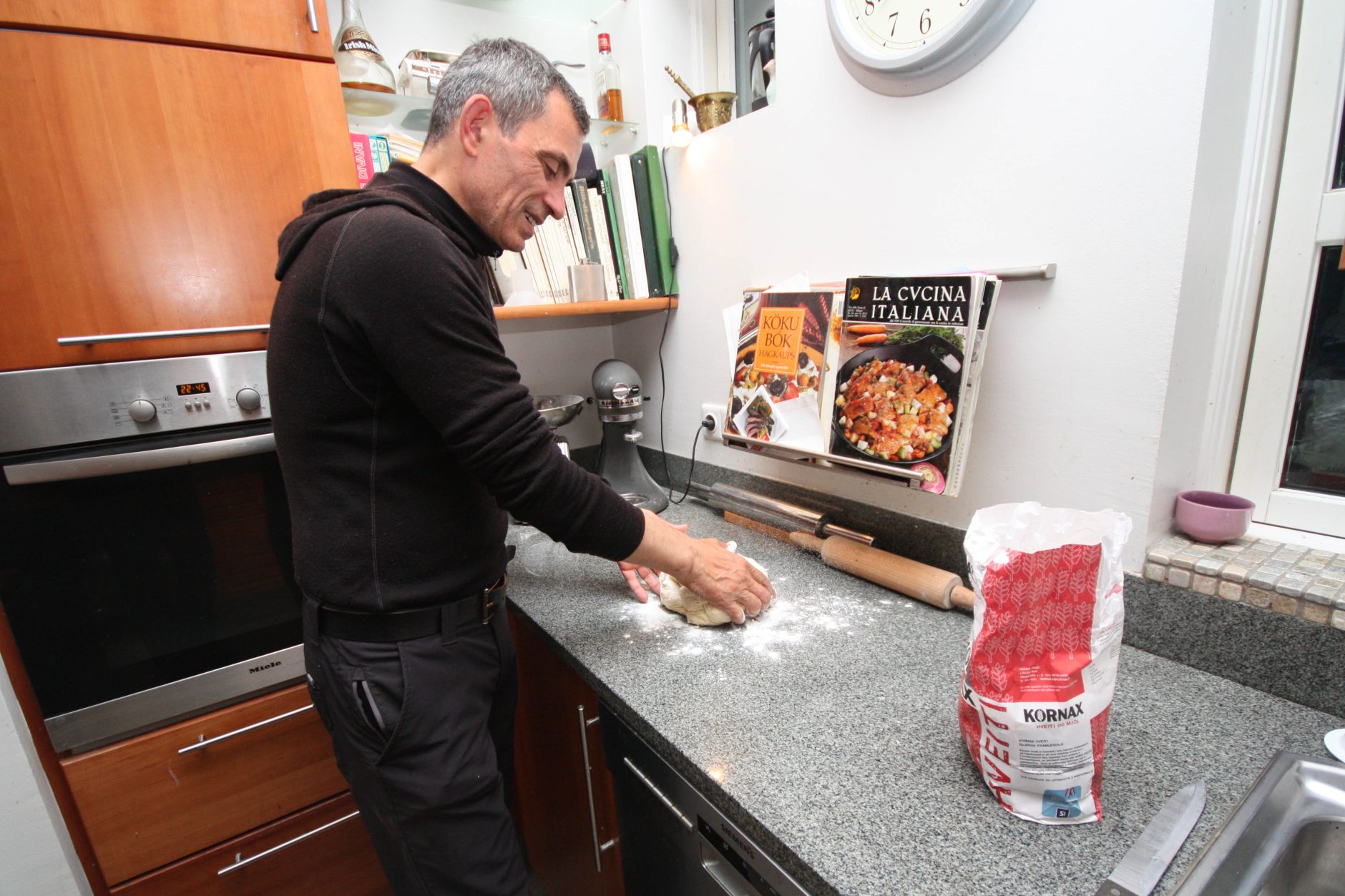Jónas sækir brauðdeigsklump sem hann hafði undirbúið áður. „Uppskriftin er eins og pizzadeig, nema það er eitt egg til viðbótar. Svona til að halda mýktinni í deiginu. Hér skiptir miklu máli að fletja deigið út alveg þar til það er orðið eins og pappír. Svo nuddum við olíu vel á, brjótum saman og endurtökum svo við fáum fjögur lög, með olíu á milli.