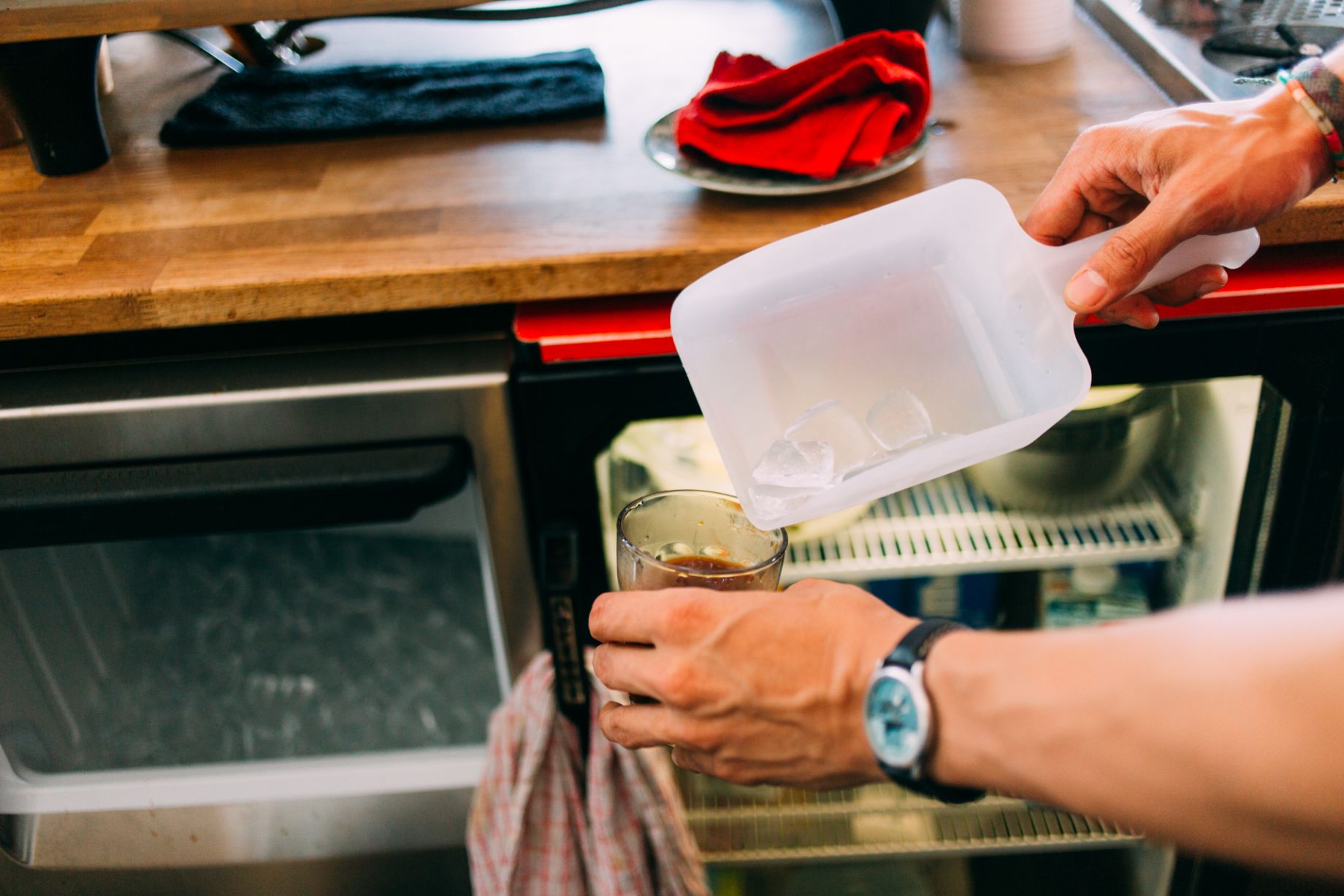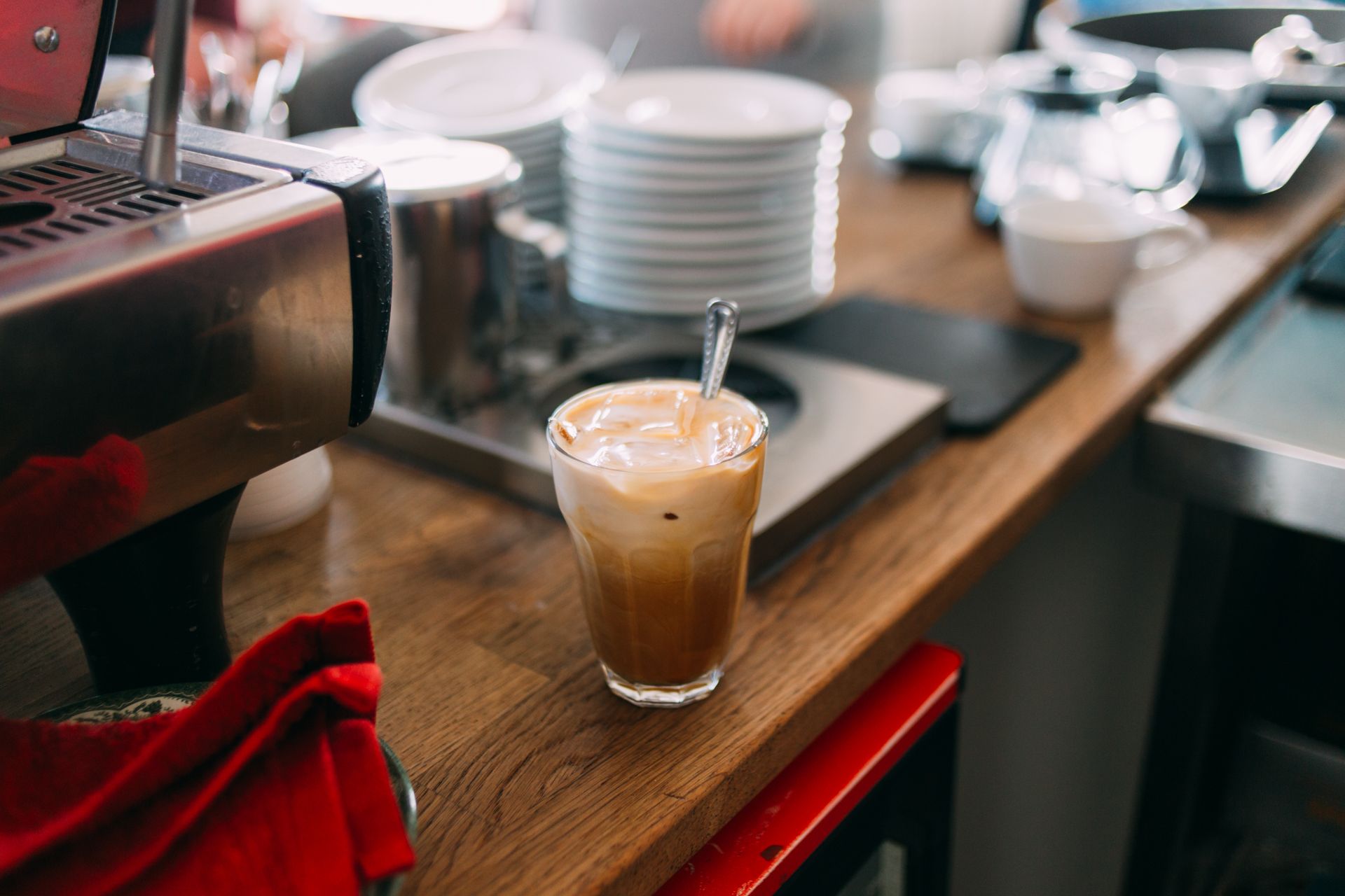 „Hellt er upp á tvöfaldan espressó og nóg af klökum bætt út í. Við erum vanalega með lífræna mjólk frá Bióbú sem gefur áberandi besta bragðið en núna er tímabundin bilun í áfellingarvélinni þeirra svo við látum nýmjólkina duga. Það skemmtilega við lífrænu mjólkina er hversu lifandi hún er. Hún breytist dag frá degi allt eftir því hvað kýrin borðar og hvaða árstíð er. Út í þetta bætum við síðan einu skoti af hrásykurssírópi sem við útbúum hérna, en það er hægt er að nota hvaða sætu sem er. Drykkurinn er ekki hugsaður sem sætur drykkur heldur er þetta rétt til að losna við beiskjuna sem kemur við að kæla kaffi.“